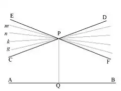 В гіперболічній геометрії згідно аксіоми паралельності на гіперболічній площині через точку Р, що не лежить на прямій АB, проходить більше однієї прямої, що не перетинають АB. Прямі, що не перетинають АB, заповнюють частину пучка з вершиною Р, яка лежить усередині пари вертикальних кутів EPC и DPF, розташованих симметрично відносно перпендикуляра PQ до прямої АB. Прямі, що утворюють сторони вертикальних кутів, відділяють прямі, що перетинають АB, від прямих, що її не перетинають і сами є такими, що не перетинають. Ці граничні прямі будуть паралельними в точці Р до прямої АB відповідно у двох її напрямках. Інші прямі, що не перетинають АB, називаються розбіжними з цією прямою.