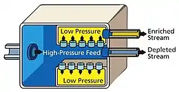 Пояснимо другий фактор. На кожній зі стадій збагачення потік розділяється на дві частини — збагачену і збіднену потрібним ізотопом. Оскільки ступінь збагачення надзвичайно низький, сумарна маса ізотопу у відпрацьованій сировині може перевищити його масу в збагаченому продукті. Для виключення такої втрати сировини збіднений потік кожного наступного ступеня потрапляє знову на вхід попереднього.