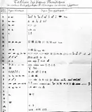 Таблиця Йогана Девіда Окерблада з зображенням демотичних фонетичних знаків та їх коптських еквівалентів (1802)