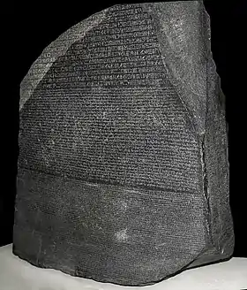 Розетський камінь — гранодіоритова стела, знайдена французькою армією Наполеона 1799 року. На ній висічено три версії указу мемфіських жерців, виданого в Мемфісі (Єгипет) 196 року до н. е., за часів правління династії Птолемеїв від імені царя Птолемея V. Верхній і середній написи зроблено давньоєгипетською мовою, відповідно, давньоєгипетськими ієрогліфами (священною мовою жерців) і демотичним письмом (поширеним у тодішню епоху скорописом), тоді як нижній напис зроблено однією з давньогрецьких мов — койне. Оскільки існують лише незначні відмінності між трьома версіями указу, то Розетський камінь став ключем до розшифрування єгипетських ієрогліфів, тим самим відкривши вікно в історію Стародавнього Єгипту.