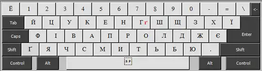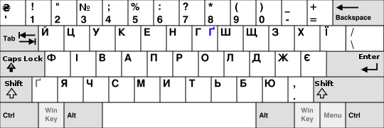 - літера Ґ розміщена на клавіші ліворуч від Я (проте ця клавіша фізично присутня не на всіх клавіатурах), а також на третьому/четвертому рівнях клавіші Г.