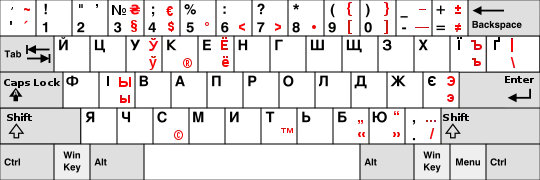 Більшість із цих додаткових символів набираються при натисканні правої клавіші Alt (в системах X.org це можна змінити) (так званий «третій рівень») або комбінації правої клавіші Alt і клавіші Shift (так званий «четвертий рівень») — на малюнку вони позначені червоним кольором.