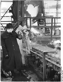 Біля стрічки розливної машини під час розливання чавуну. На задньому плані — нахилений чавуновозний ківш, з якого рідкий чавун зливається на стрічки машини. НДР, 1956 рік.