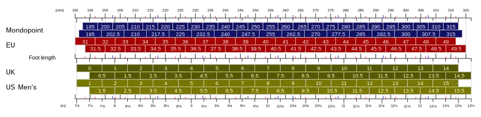 Розмір вимірюється від найбільш виступаючої точки п'ятки до найбільш виступаючого пальця, в міліметрах, без урахування декоративних припусків.[4]