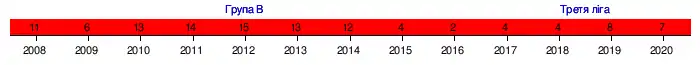 | 2009–10 | Група В (III) | 13 | 12 | 4 | 20 | 54 | 76 | 40 | не кваліфікувалась | ||