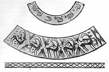 Перший пояс має ширину 7,5 см і покритий темно-червоними і чорними зображеннями гусей і лебедів[5], розташованих у строгому ритмі[2]. Ширина другого поясу — 16 см. Тут зображені різні сцени циклу «боротьби звірів». На цих малюнках хижі звірі і птахи нападають на диких кіз, осла, вола і зубра. Між звірами зображені водоплавні птахи[5]. За словами мистецтвознавця Володимира Шлєєва, схематизовані сцени полювання вовків (або собак) і хижих птахів на диких кіз, осла і бика на цьому поясі розміщені строго ритмічно[8]. Третій пояс містить простий орнамент[5], що складається зі схрещених смужок, які утворюють ромби[7]. Його ширина — 3,5 см[5].