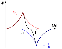 де n — кількість атомів у молекулі, , ,… — хвильові функції електронних орбіталей атомів, що взаємодіють, с — числові коефіцієнти, які визначають внесок кожної АО у МО і значення яких визначають з огляду на умову мінімуму енергії. У разі віднімання (-) , … (знаки обох функцій від'ємні), хвильова функція спадає і абсолютне значення хвильової функції у просторі між ядрами зменшується. Це означає, що при утворенні молекулярної орбіталі густина електронної хмари у між'ядерному просторі зменшується, внаслідок чого атомні ядра молекули притягуються не до між'ядерної області, а до периферії молекули, тобто ніби відштовхуються одне від одного. В даному випадку хімічний зв'язок між атомами не виникає. На такій МО електрон матиме більшу енергію, як на вихідній АО і не створюватиме зв'язку.