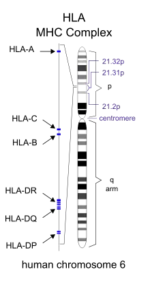 Специфічні гени, що пов'язують з МС, включають різницю в системі людського лейкоцитарного антигену (HLA) — групі генів хромосоми 6, що слугує основним комплексом гістосумісності (ОКГ).[10] Такі зміни в ділянці HLA пов'язані зі схильністю до захворювання, що відома вже більше тридцяти років,[37] та, додатково, ця ж ділянка бере участь в розвитку інших автоімунних захворювань, таких як діабет типу I та системний еритематозний вовчак.[37] Найбільш послідовними результатами є зв'язок між множинним склерозом та алелями ОКГ, визначеним як DR15 та DQ6.[10] Інші локуси показали захисний ефект, наприклад, HLA-C554 та HLA-DRB1*11.[10] Загалом, згідно з оцінками, до зміни HLA належить 20-60 % генетичної схильності.[37] Завдяки сучасним генетичним методам (дослідження геному) відкрито принаймні дванадцять інших генів поза областю HLA, що помірно підвищують можливість МС.[37]