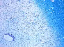 ![]() Демієлінізація при розсіяному склерозі. ЗабарвленаCD68 тканина показує кілька макрофагів у зоні ураження. Вихідний масштаб 1:100 Демієлінізація при розсіяному склерозі. ЗабарвленаCD68 тканина показує кілька макрофагів у зоні ураження. Вихідний масштаб 1:100 | |