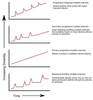 Виділяють декілька основних підтипів серед форм перебігу множинного склерозу. Інформація про перебіг захворювання в минулому використовується для того, щоб передбачити його перебіг в майбутньому. Знання про форму перебігу хвороби важливе не тільки для надання прогнозу, але й для прийняття рішень щодо лікування. У 1996 році Національне товариство з вивчення множинного склерозу в США описало чотири форми перебігу МС:[13]