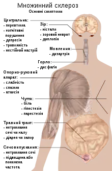 Розсіяний склероз, або множинний склероз (МС, або лат. encephalomyelitis disseminata) — хронічне запальне захворювання центральної нервової системи, при якому власні імунні клітини організму хворого атакують мієлін, «ізолюючу оболонку», котра оточує нервові волокна. Мієлінова оболонка відіграє вирішальну роль в роботі центральної нервової системи. Це спеціалізована збагачена ліпідами мембрана, яка забезпечує швидку й ефективну передачу електричних імпульсів. При розсіяному склерозі автоімунна атака на мієлінову оболонку спричиняє різні неврологічні розлади, в першу чергу втрату моторної функції. При розсіяному склерозі відбувається одночасне ураження відразу декількох відділів нервової системи, що в підсумку призводить до появи найрізноманітніших неврологічних симптомів. Втрата мієліну порушує зв'язок частин нервової системи, в результаті чого виникає значна кількість ознак та симптомів,[10][11] включаючи фізичні, розумові,[11] та, іноді, психічні проблеми.[12] МС може мати кілька форм, в яких нові симптоми проявляються окремими приступами (форми з рецидивами) чи накопичуються з часом (прогресуючі форми).[13] В періоди між приступами симптоми можуть повністю зникати; однак, часто мають місце постійні неврологічні проблеми, особливо з розвитком хвороби.[13]
