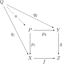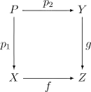 - Якщо f у наведених в означенні діаграмах є мономорфізмом то p2 теж є мономорфізмом. Також якщо g є мономорфізмом, то мономорфізмом є також і p1.