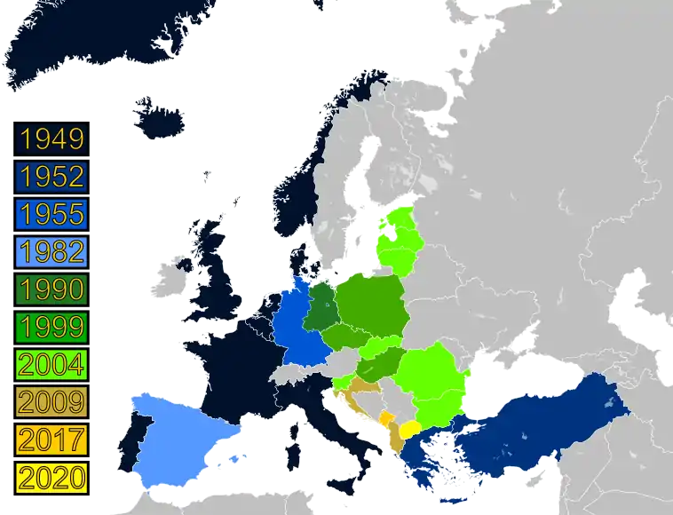 Після утворення в 1949 р. з дванадцятьма членами-засновниками НАТО зросло шляхом включення Греції та Туреччини в 1952 р. та Західної Німеччини в 1955 р., а потім Іспанії в 1982 році. Після закінчення "холодної війни" та возз'єднання Німеччини в 1990 р. в НАТО відбулися дебати про продовження експансії на схід. У 1999 р. Польща, Угорщина та Чехія приєдналися до НАТО на тлі багатьох дебатів в організації та протидії Росії. Ще одне розширення відбулося з приєднанням семи країн Центральної та Східної Європи: Болгарії, Естонії, Латвії, Литви, Румунії, Словаччини та Словенії. Вперше ці країни були запрошені розпочати переговори про членство під час самміту в Празі 2002 року та вступили до НАТО незадовго до саміту 2004 року в Стамбулі. Албанія та Хорватія приєдналися 1 квітня 2009 р. До саміту Страсбург – Кель 2009 р. Останніми державами-членами, які вступили НАТО є Чорногорія — 5 червня 2017 року та Північна Македонія 27 березня 2020 року.