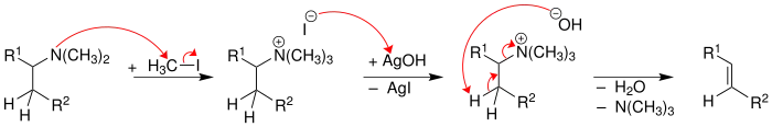 На першій стадії вихідний первинний, вторинний або третинний амін оброблюється йодометаном, після чого при взаємодії з оксидом срібла утворює четвертинну основу. Водний або спиртовий розчин отриманої основи переганяють за нормального або зниженого тиску, внаслідок чого відбувається відщеплення третинного аміну й утворення алкену: