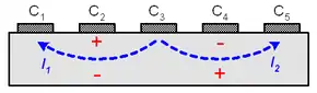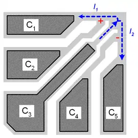![]() РХС з кутовим розміщенням чутливої ділянки (C3 – центральний струмовий контакт, C1, C5 – бокові струмові контакти, C2, C4 – потенціальні контакти) |