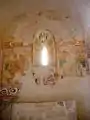 На видовженій частині стіни художник подав сцену наближення Христа до воріт Єрусалима. Фігури Христа і апостолів подані майже у повний зріст дорослих людей. Христос їде на осляті, поряд з котрим іде малий віслючок. За Христом пішки ідуть сім апостолів босоніж. Нестача місця та майстерності примусила художника припускатися умовностей та скорочень. Так, апостоли подані щільною купкою, наче притиснуті один до одного. Зображення Єрусалима - це умовний знак міста взагалі і він менший за зріст дорослої людини. Натовп мешканців міста, що зустрічає Христа і апостолів, вимушено скорочений до двох юнаків, що кидають гілки під ноги Христа як ознака його вітання[1]. Умовність фрески відбилась також у ізокефалії (всі голови апостолів та Христа подані на одній висоті, хоча люди не могли бути такими однаковими на зріст.) Водночас художник намагався додати індивідуальності кожному з апостолів, подаючи тут чоловіків різного віку та з різними зачісками різнокольорового волосся.