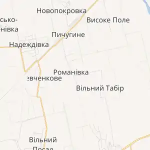 Село Романівка знаходиться на відстані 0,5 км від селища Пичугине і за 1,5 км від села Вільний Табір. У селі бере початок річка Балка Широка. Поруч проходить залізниця, станція Пічугіно за 1 км.
