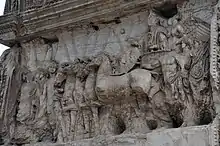 На арці Тита (І ст. н. е.), арці Септімія Севера та арці Костянтина Рома супроводжує імператора на колісниці.