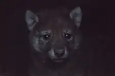 Вовченя визирає із темряви лігва. |