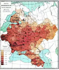 За переписом 1897 року населення Російської імперії становило 125 640 021 особу (62 477 348 чоловіків і 63 162 673 жінки). Населення Європейських губерній становило 93,4 млн осіб, Царства Польського — 9,5 млн, Великого князівства Фінляндського — 2,6 млн, Кавказького краю — 9,3 млн, Сибіру — 5,8 млн, середньоазійських областей — 7,7 млн.