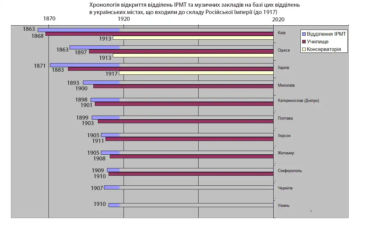 На території України відділення ІРМТ було відкрито в 11 містах — у Києві, Одесі, Харкові, Миколаєві, Катеринославі (Дніпро), Полтаві, Херсоні, Житомирі, Сімферополі, Чернігові та Умані. В 9 містах при відділеннях ІРМТ були відкриті музичні училища (натомість в Чернігові та Умані музичні училища відкрились вже за часів СРСР).