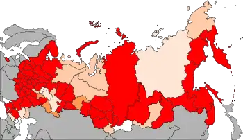 Значна частина росіян живе в центральній частині, на півдні і північному заході Росії, на Уралі[5]. За даними перепису населення 2010 року, серед суб'єктів Російської Федерації найбільший відсоток російського населення відзначений у Брянській області (94,7 %)[6]. Частка росіян перевищує 90 % в 30 суб'єктах Федерації — головним чином це області Центрального і Північно-Західного федеральних округів, а також південь Сибіру. Найменше число росіян — в Інгушетії, Чечні і Дагестані (менше ніж 5 %)[5].