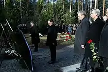 Теорії змови були в обігу з дня Смоленської авіаційної катастрофи 10 квітня 2010 року, коли літак Туполева Ту-154 польських ВПС розбився поблизу російського міста Смоленська, заявляючи загалом, що аварія насправді була політичною вбивство, акт війни проти Польщі або продумана спроба перевороту, можливо організована Росією.[84][85] Лідера "Права і справедливості "Ярослава Качинського та керівника парламентського комітету з розслідування Антонія Мацієревича називають давніми прихильниками теорії вбивства.[86][87] Мацієревич повторив ці звинувачення в якості новопризначеного міністра оборони у 2016 році, викликавши значні суперечки в польських, російських та міжнародних ЗМІ.[88] Опитування громадської думки 2013 року показали, що більше третини поляків вважають можливим, що смоленська катастрофа була вбивством.[89]