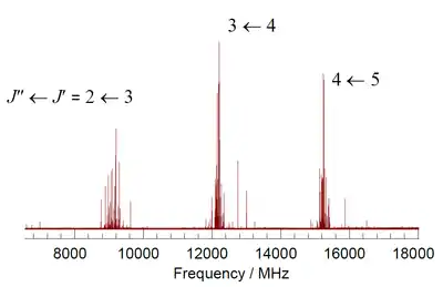 - Спектр було виміряно упродовж пари годин за допомогою пульсуваного мікрохвильового спектрометра з Фур'є перетворювачем у Бристольському університеті