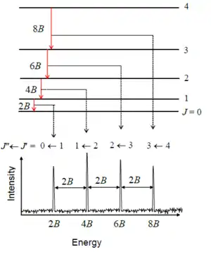 Діаграма ілюструє обертальні переходи, підпорядковані правилу відбору =1. Штриховими лініями показано як ці переходи вписуються в експериментальну структуру спектру. Суміжні переходи в спектрі розділені величиною 2B.