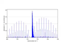 ![]() Спектр коливань на розтяг-стиснення C-Cl зв'язку в CH3Cl (паралельна смуга), розрахований програмою Spectralcalc[10] |