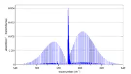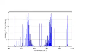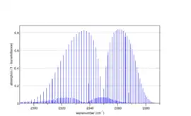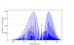 ![]() Спектр паралельної смуги асиметричної моди коливань згину в діоксиді карбону (вуглекислому газі) 12C16O2, розрахований програмою Spectralcalc[10]. Слабкий накладений спектр пояснюється поглинанням першого збудженого коливального рівня (0 11 0), який завдяки малій енергії заселений при кімнатній температурі |