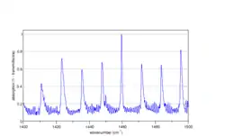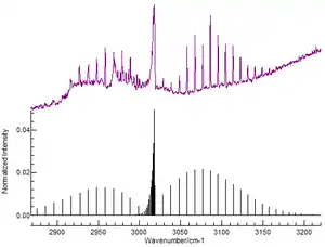 ![]() Частина спектру асиметричних коливань згину H-C-H в CH3Cl (перпендикулярна смуга), розрахована програмою Spectralcalc[10] |