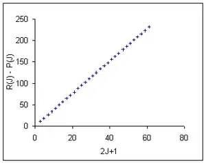 оскільки S-гілка починається з J=0, а O-гілка з J=2. Тому, в першому наближенні проміжок між S(0) та O(2) дорівнює 12B, а відстань між сусідніми лініями дорівнює 4B як в O-, так і в S-гілках. Найбільш очевидний ефект нерівності обертових сталих B′′ ≠ B′ у тому, що Q-гілка має серію щільно розташованих сателітів завдяки переходам з ΔJ=0 для J=1,2 тощо[20]. Корисні різницеві формули, в яких знехтувано відцентровою дисторсією[21] суть: