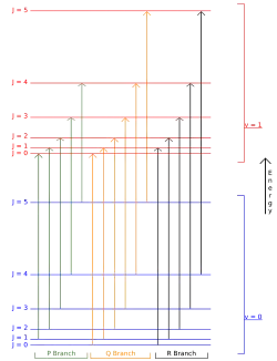 - Зміна енергії обертання може як відніматися так і додаватися до зміни енергії коливання, що призводить до утворення P- and R- гілок спектру, відповідно.