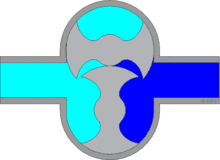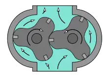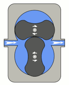 Принцип роботи показано на ілюстраціях і, який нічим не відрізняється як для газів, так і для рідин. Середовище, яке перекачується, потрапляє у робочі камери, утворені між витискачами і корпусом, переноситься із зони засмоктування у зону нагнітання.
