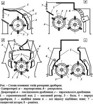 Роторні дробарки бувають одно- і двороторні з послідовним дробленням матеріалу кожним ротором або з одночасним дробленням двома роторами, з колосниковою решіткою і без неї. Однороторні дробарки бувають реверсивні і нереверсивні. Характерною особливістю роторних дробарок є те, що в ударі по грудках вихідного матеріалу бере участь масивний ротор, тому удари значно міцніші ніж у молоткових дробарках. Це дозволяє застосовувати роторні дробарки у першій стадії дроблення (дробарки типу ДРК) для руйнування порівняно твердих гірських порід. Роторні дробарки застосовують також для середнього та дрібного дроблення (дробарки типу ДРС). Конструкції дробарок ДРК і ДРС аналогічні.