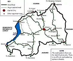 Загальна протяжність шляхів Руанди становить 12 000 км, з яких лише 1 000 км мощені.[8] Інші дороги є ґрунтовими, з яких деякі є якісними, рівними та оснащеними інфраструктурою, а деякі настількі ямкові, що їхати ними можна лише чотириколісним транспортом.