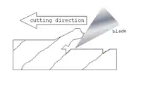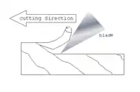 При поздовжньому різанні ніж, проникаючи в деревину, сколює (відщеплює) стружку. Від кута різання залежить швидкість заламування стружки і поява випереджальної тріщини: чим менший кут різання, тим імовірнішою є поява випереджальної тріщини і, як наслідок цього, погіршення якості обробки. У більшості рубанків для обробки плоских поверхонь кут різання становить 45…80°. При збільшеному куті різання відбувається прискорене заломлення стружки, випереджальні тріщини не виникають і при цьому доводиться докладати більше зусиль для стругання.