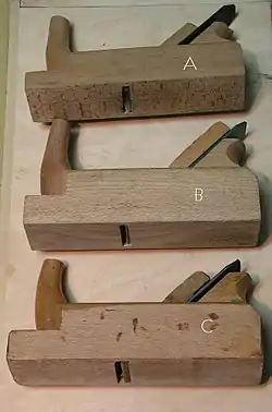 A-шерхебель, B-одинарний рубанок, C-рубанок з подвійним ножем