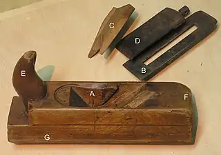 Рубанок зроблений настільки точно, що залізко у формі клина саме може заклинюватися та утримуватися під час стругання. Також може бути встановлений стружколамач у вигляді сталевої загостреної пластини, яка утримується за рахунок заклинювання між залізком та штифтом (див. фото).