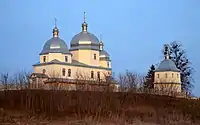 Вигляд на церкву з дзвіницею від села