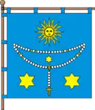 В центрі квадратного синього полотнища біла римо-католицька вервиця, в якій жовта шестипроменева зірка. Над корункою жовте усміхнене сонце з шістнадцятьма променями, прямими і хвилястими поперемінно, в нижніх кутках прапора по одній жовтій шестипроменевій зірці, більших за середню.