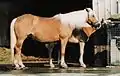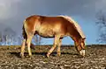 Кінь породи хафлінгер світло-ігреневого відтінку рудої масті.