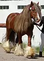 Кінь ірландської (тінкер) породи вугільно-ігреневого відтінку рудої масті.