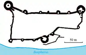 Головна вежа на півночі, вежа Саруджа Паша, має циліндричну форму діаметром 23,30 м, товщина її стін 7 м, її 9 ярусів сягають висоти 28 м. Сьогодні ця вежа також відома як "Вежа Фатіха Завойовника" на честь султана Мехмеда II Фатіха.