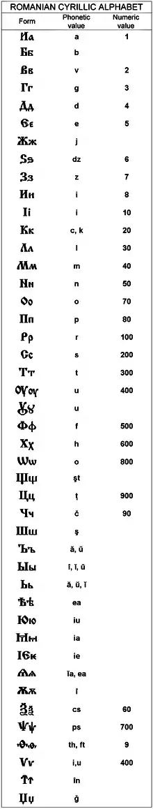 Румунська кирилиця була дуже близька до сучасної для неї церковнослов'янської; відмінності у складі абетки (на кінець XVIII і XIX ст.) такі: