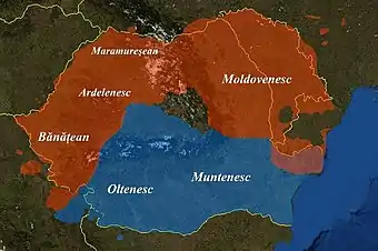 - волоський субдіалект, яким розмовляють у Південній Румунії, в історичних областях Мунтенії, Олтенії, на півдні Добруджи, а також у південних частинках Трансильванії.
