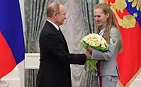 ![]() Президент Росії Володимир Путін з чемпіонкою Ігор з лижних гонок та біатлону Катериною Румянцевою Президент Росії Володимир Путін з чемпіонкою Ігор з лижних гонок та біатлону Катериною Румянцевою | |||||||||||||||||||||||||||||||||