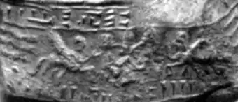 ![]() | Глиняна булла з"єднувала кінці мотузки, що пропускалась в петлі дверей, які закривали зерносховище, і таким чином опломбовували зерносховище. Для унеможливлення підробки булли на ній ставився підпис наглядача і прокочувалася його циліндрична печатка. На фотографії видно підпис і слід циліндричної печаті. |