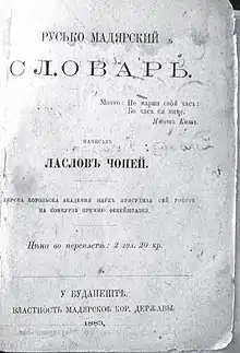 ![]() Титульна сторінка «Русько-мадярського словаря» Ласлова Чопея | |